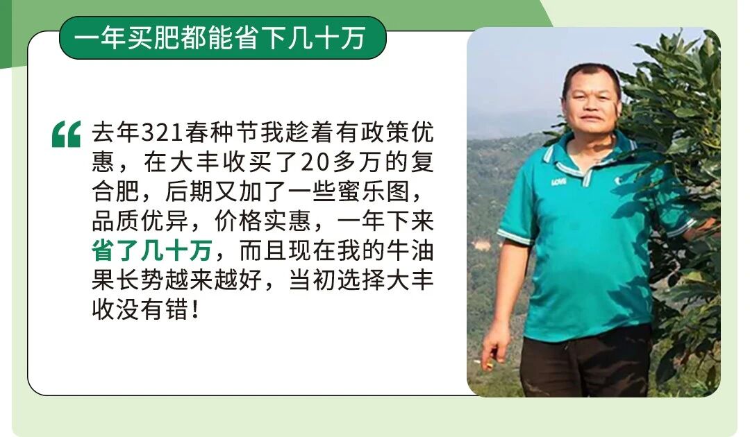 唐老板过去曾经走南闯北,四处发展种植业。种下1500亩牛油果的他,买了数十年农资,当他接触到大丰收之后,发现复合肥的价格非常划算!渐渐的,他开始将大丰收作为他采购药肥的第一选择。