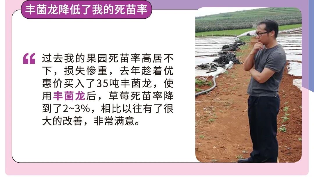 蒙自的李老板经营着50亩的草莓地,每年草莓农忙时节都要为死苗的问题难过。过去他的草莓死苗率居高不下,去年在优惠活动中下单购买的丰菌龙生物有机肥改善了草莓地的土质,当年死苗率得到大幅降低。